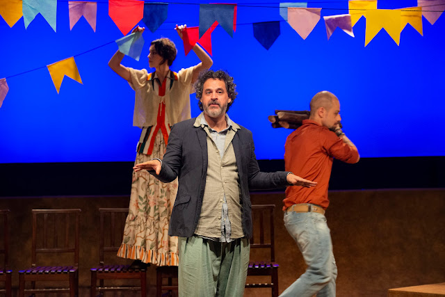 A cenografia, de NELLO MARRESE, e a iluminação, de DANI SANCHEZ, “trocam longos e deliciosos bate-papos”, ao longo de toda a peça. Aquela é bem simples, com a utilização de um praticável baixo, que serve de mesa e de “palco”, algumas cadeiras e cordões com bandeirinhas coloridas, típicas das festas juninas. E basta, para criar o universo da fazenda. Esta é muito bonita. DANI consegue ótimos efeitos de luz, para nos arrebatar, fascinar mesmo, levando-nos a aplaudir o belo e a sofrer com outras situações. (Não adianta, que não darei “spoilers”. Vá assistir à peça, que só fica em cartaz até o dia 5 de junho próximo, apenas por duas semanas! VER SERVIÇO!).
